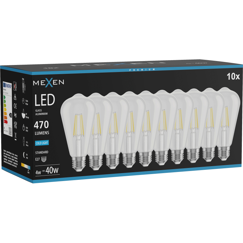 Mexen Vintis 10x żarówka filament LED E27, ST64, 4W, Zimna - 6500K, 470 lm, clear - L152-E27-0465-00x10