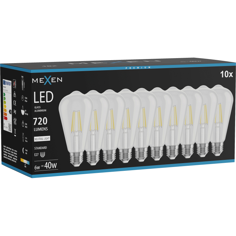 Mexen Vintis 10x żarówka filament LED E27, ST64, 6W, Neutralna - 4000K, 720 lm, clear - L152-E27-0640-00x10