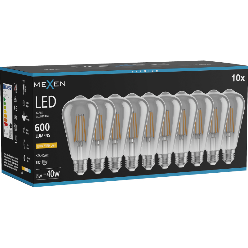 Mexen Vintis 10x żarówka filament LED E27, ST64, 8W, Ciepła - 2200K, 600 lm, smoke - L152-E27-0822-70x10