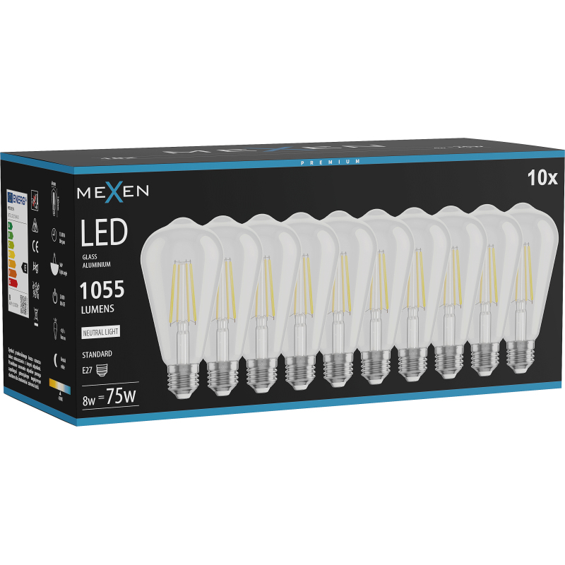 Mexen Vintis 10x żarówka filament LED E27, ST64, 8W, Neutralna - 4000K, 1055 lm, clear - L152-E27-0840-00x10