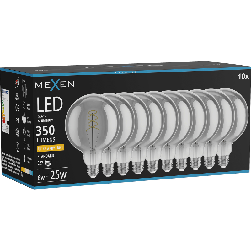 Mexen Vintis 10x LED spirálová žárovka E27, G125, 6W, teplá - 2200K, 350 lm, kouřová - L168-E27-0622-70x10