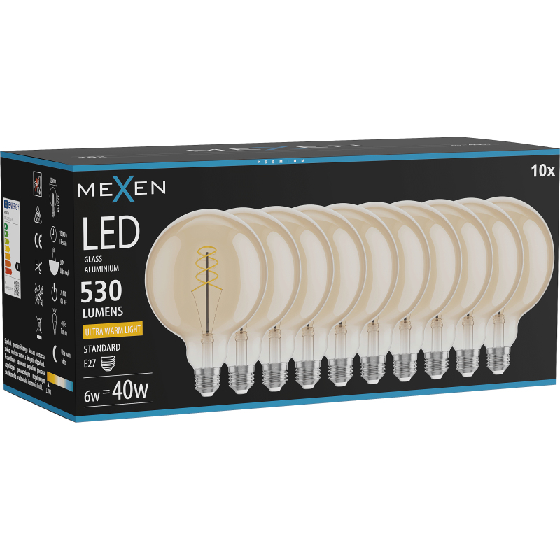 Mexen Vintis 10x LED spirálová žárovka E27, G125, 6W, teplá - 2200K, 530 lm, jantarová - L168-E27-0622-50x10