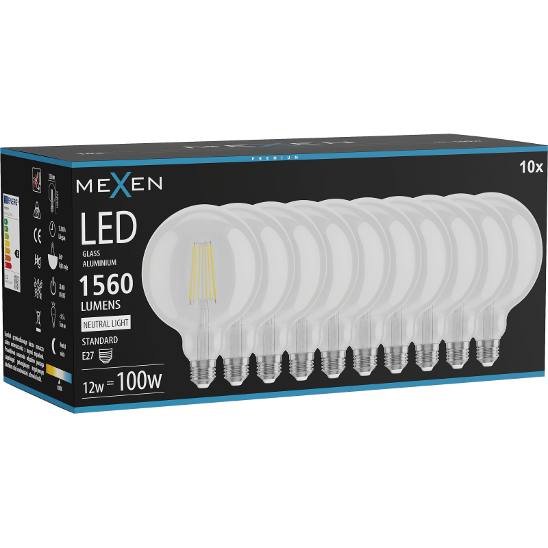 Mexen Vintis 10x LED žárovka s vláknem E27, G125, 12W, neutrální - 4000K, 1560 lm, čirá - L158-E27-1240-00x10