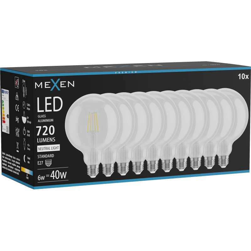 Mexen Vintis 10x LED žárovka s vláknem E27, G125, 6W, neutrální - 4000K, 720 lm, čirá - L158-E27-0640-00x10