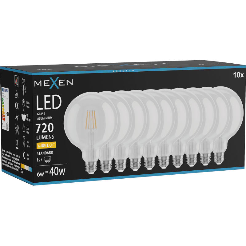 Mexen Vintis 10x LED žárovka s vláknem E27, G125, 6W, teplá - 2700K, 720 lm, čirá - L158-E27-0627-00x10