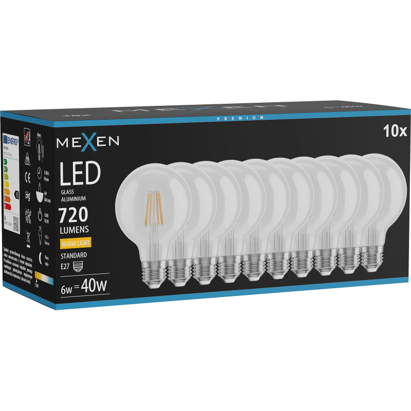 Mexen Vintis 10x LED žárovka s vláknem E27, G80, 6W, teplá - 2700K, 720 lm, čirá - L155-E27-0627-00x10