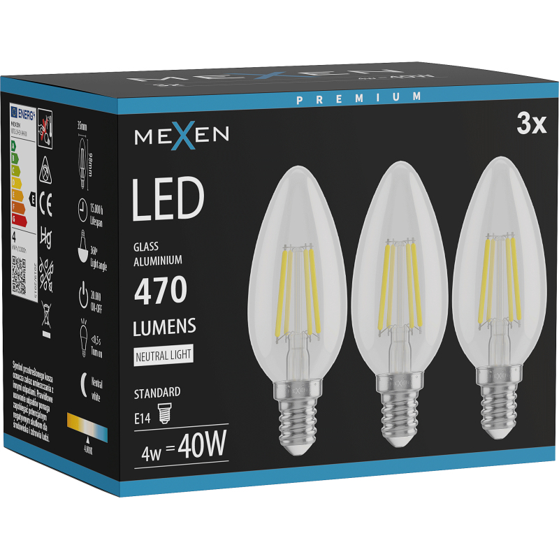 Mexen Vintis 3x żarówka filament LED E14, C35, 4W, Neutralna - 4000K, 470 lm, clear - L154-E14-0427-00x03
