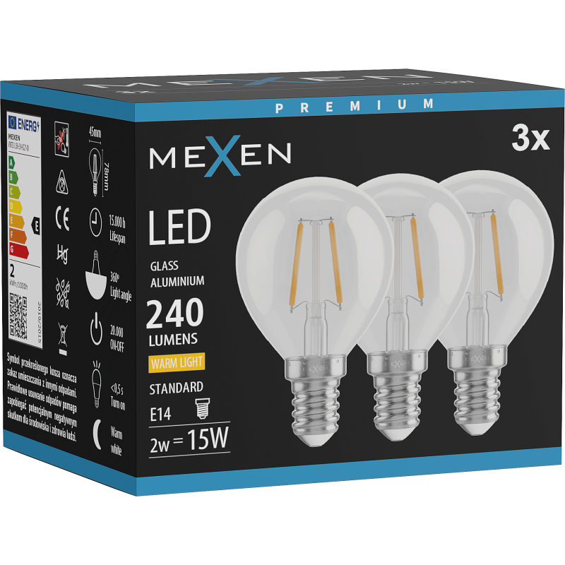 Mexen Vintis 3x żarówka filament LED E14, G45, 2W, Ciepła - 2700K, 240 lm, clear - L156-E14-0227-00x03