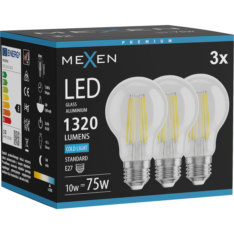 Mexen Vintis 3x żarówka filament LED E27, A60, 10W, Zimna - 6500K, 1320 lm, clear - L150-E27-1065-00x03