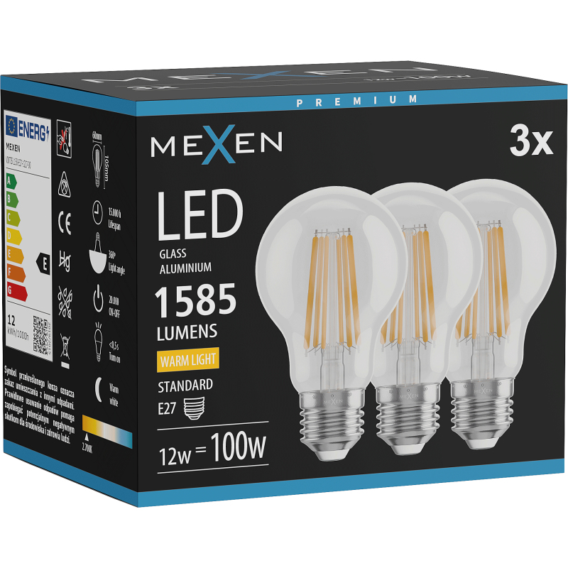 Mexen Vintis 3x żarówka filament LED E27, A60, 12W, Ciepła - 2700K, 1585 lm, clear - L150-E27-1227-00x03