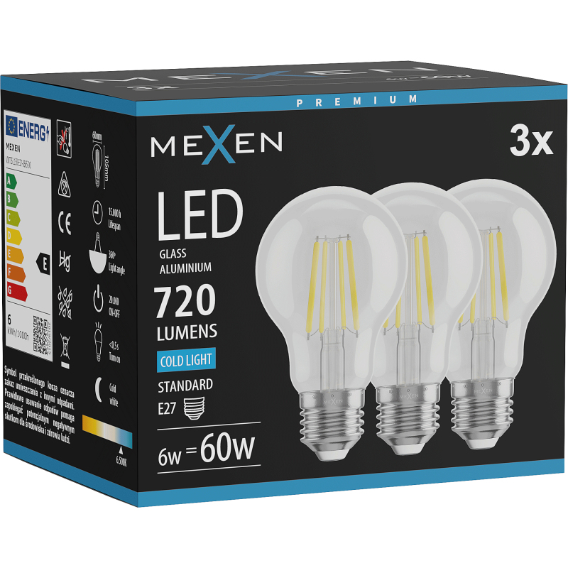 Mexen Vintis 3x żarówka filament LED E27, A60, 6W, Zimna - 6500K, 720 lm, clear - L150-E27-0665-00x03
