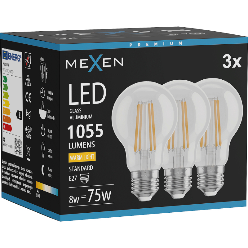 Mexen Vintis 3x żarówka filament LED E27, A60, 8W, Ciepła - 2700K, 1055 lm, clear - L150-E27-0827-00x03