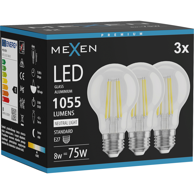 Mexen Vintis 3x żarówka filament LED E27, A60, 8W, Neutralna - 4000K, 1055 lm, clear - L150-E27-0840-00x03