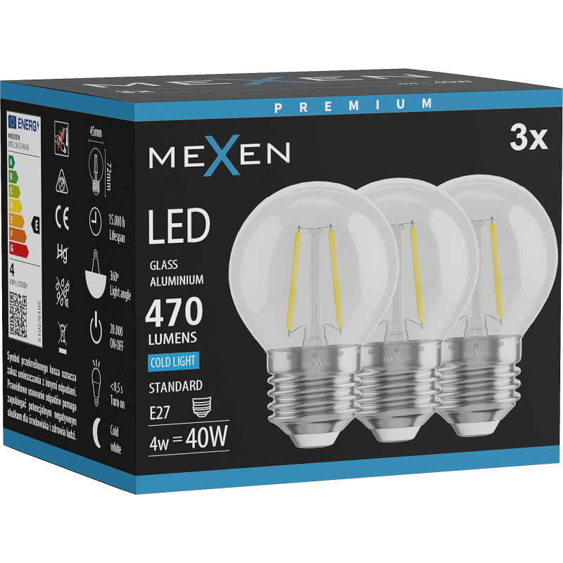 Mexen Vintis 3x żarówka filament LED E27, G45, 4W, Zimna - 6500K, 470 lm, clear - L156-E27-0465-00x03
