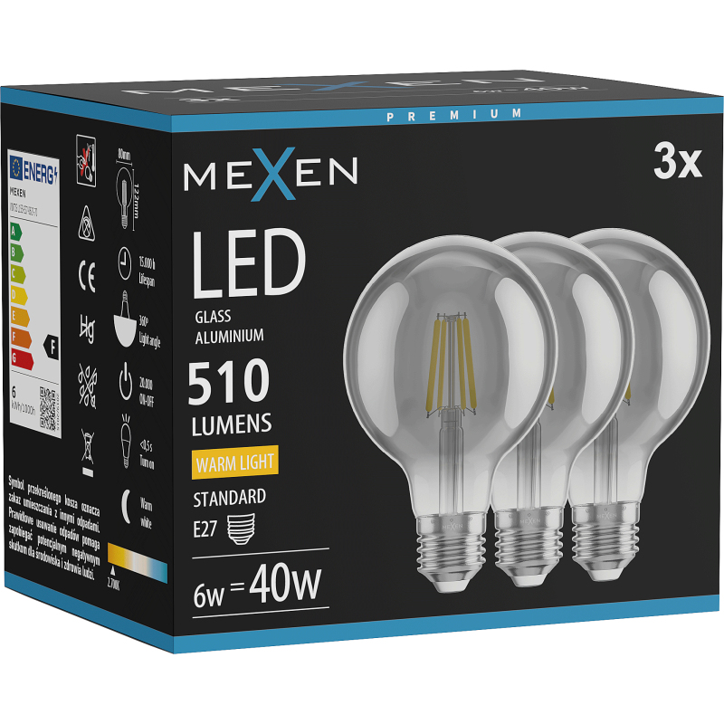 Mexen Vintis 3x żarówka filament LED E27, G80, 6W, Ciepła - 2700K, 510 lm, smoke - L155-E27-0627-70x03