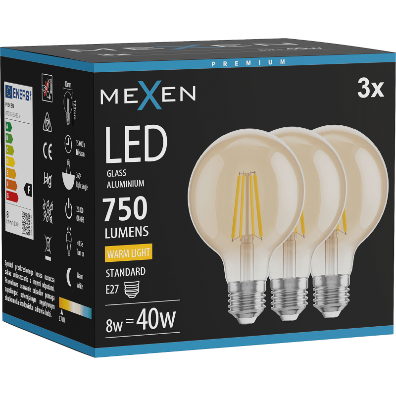 Mexen Vintis 3x żarówka filament LED E27, G80, 8W, Ciepła - 2700K, 750 lm, amber - L155-E27-0827-50x03