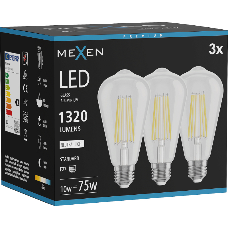 Mexen Vintis 3x żarówka filament LED E27, ST64, 10W, Neutralna - 4000K, 1320 lm, clear - L152-E27-1040-00x03