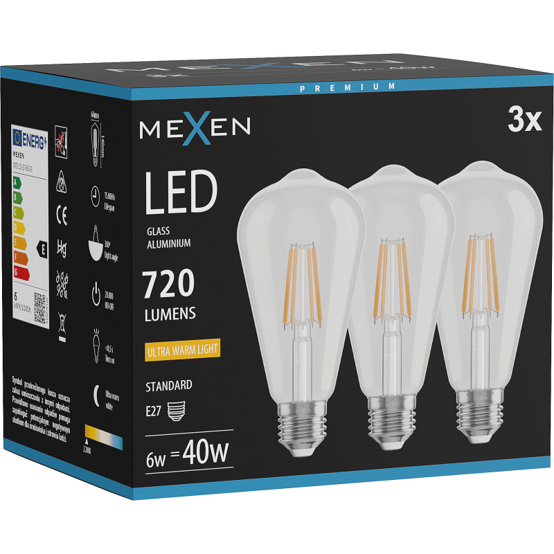 Mexen Vintis 3x żarówka filament LED E27, ST64, 6W, Ciepła - 2200K, 720 lm, clear - L152-E27-0622-00x03