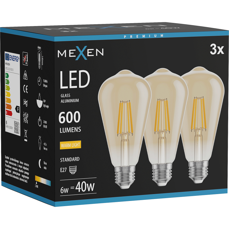 Mexen Vintis 3x żarówka filament LED E27, ST64, 6W, Ciepła - 2700K, 600 lm, amber - L152-E27-0627-50x03