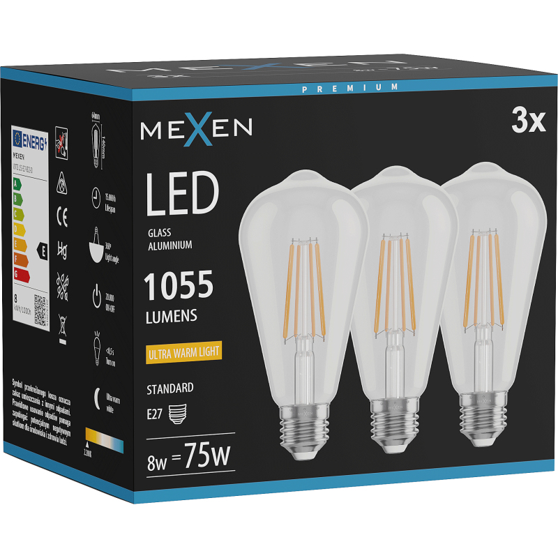 Mexen Vintis 3x żarówka filament LED E27, ST64, 8W, Ciepła - 2200K, 1055 lm, clear - L152-E27-0822-00x03