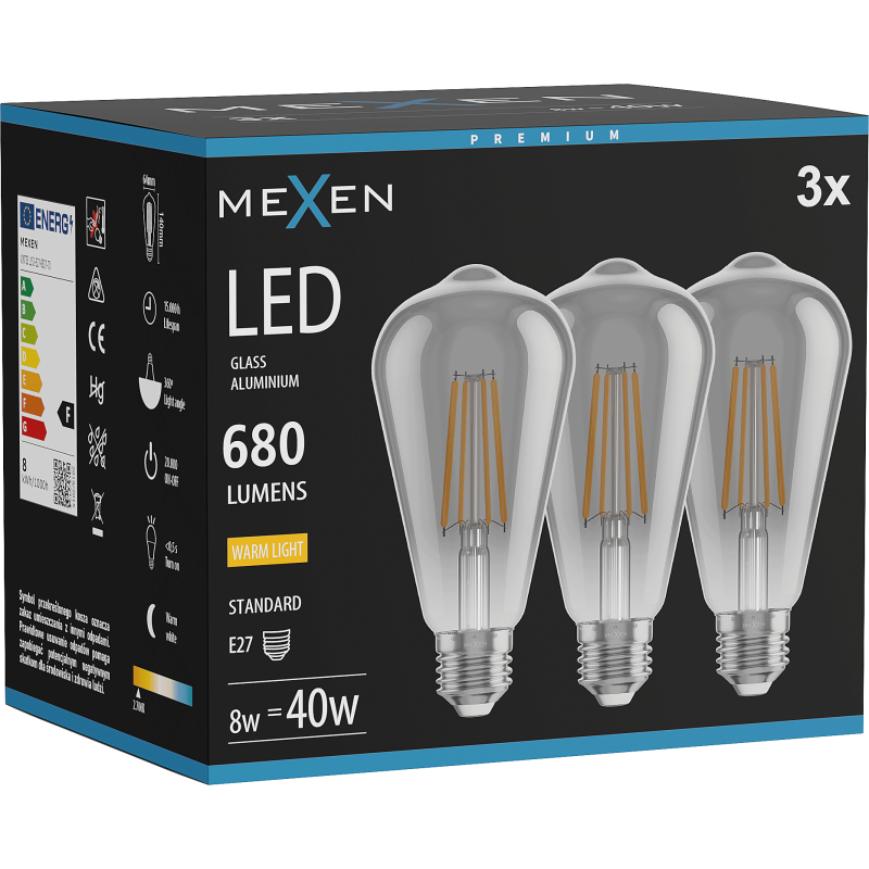 Mexen Vintis 3x żarówka filament LED E27, ST64, 8W, Ciepła - 2700K, 680 lm, smoke - L152-E27-0827-70x03