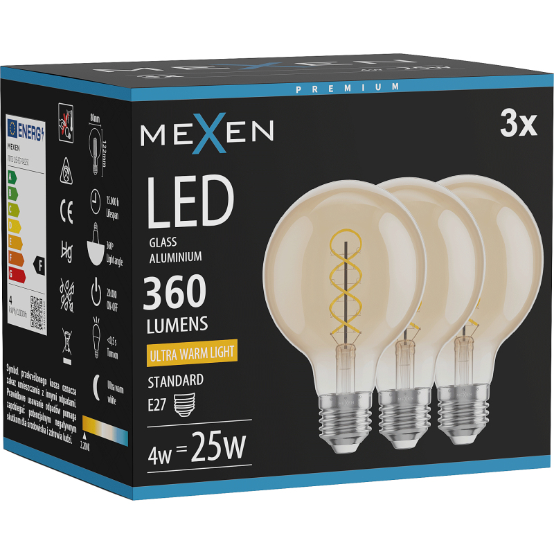 Mexen Vintis 3x żarówka filament spirala LED E27, G80, 4W, Ciepła - 2200K, 360 lm, amber - L165-E27-0422-50x03