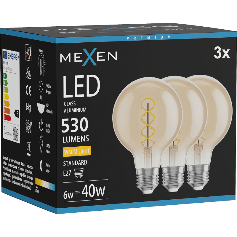 Mexen Vintis 3x żarówka filament spirala LED E27, G80, 6W, Ciepła - 2700K, 530 lm, amber - L165-E27-0627-50x03