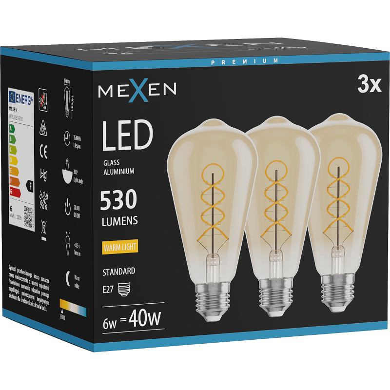 Mexen Vintis 3x żarówka filament spirala LED E27, ST64, 6W, Ciepła - 2700K, 530 lm, amber - L162-E27-0627-50x03