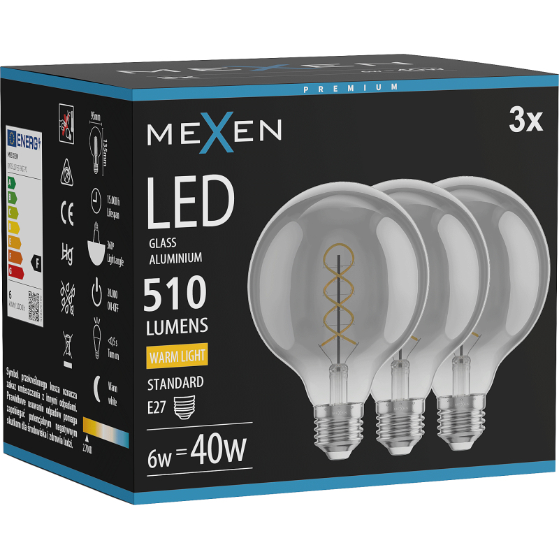 Mexen Vintis 3x LED spirálová žárovka E27, G95, 6W, teplá - 2700K, 510 lm, kouřová - L167-E27-0627-70x03