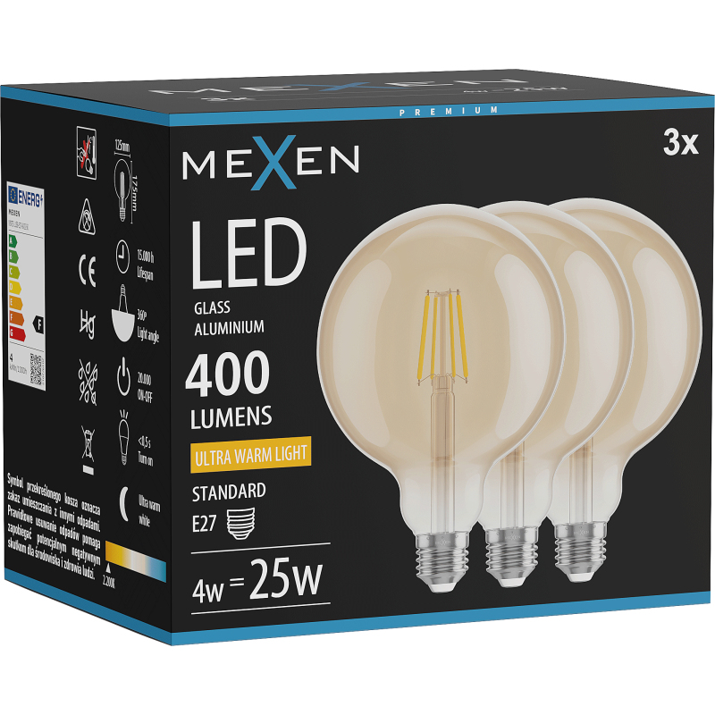 Mexen Vintis 3x LED žárovka s vláknem E27, G125, 4W, teplá - 2200K, 400 lm, jantarová - L158-E27-0422-50x03