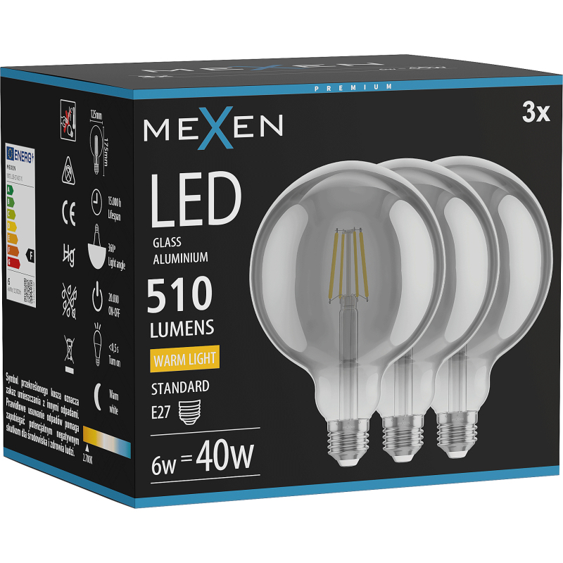 Mexen Vintis 3x LED žárovka s vláknem E27, G125, 6W, teplá - 2700K, 510 lm, kouřová - L158-E27-0627-70x03
