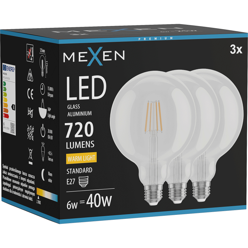 Mexen Vintis 3x LED žárovka s vláknem E27, G125, 6W, teplá - 2700K, 720 lm, čirá - L158-E27-0627-00x03