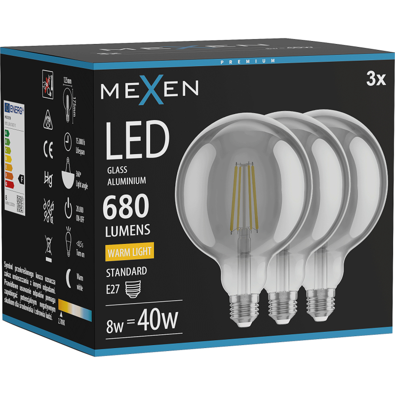 Mexen Vintis 3x LED žárovka s vláknem E27, G125, 8W, teplá - 2700K, 680 lm, kouřová - L158-E27-0827-70x03