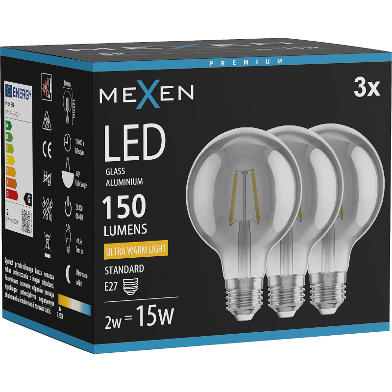 Mexen Vintis 3x LED žárovka s vláknem E27, G80, 2W, teplá - 2200K, 150 lm, kouřová - L155-E27-0222-70x03