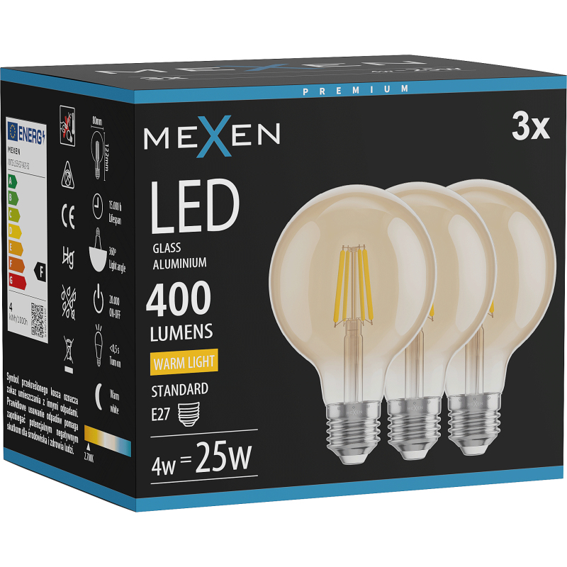 Mexen Vintis 3x LED žárovka s vláknem E27, G80, 4W, teplá - 2700K, 400 lm, jantarová - L155-E27-0427-50x03