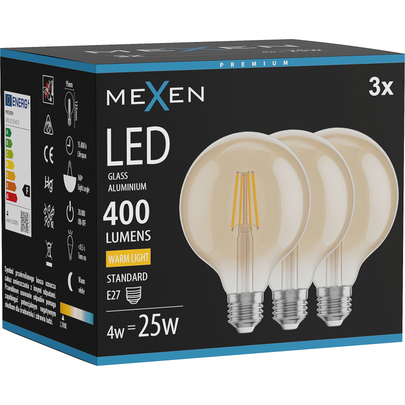 Mexen Vintis 3x LED žárovka s vláknem E27, G95, 4W, teplá - 2700K, 400 lm, jantarová - L157-E27-0427-50x03