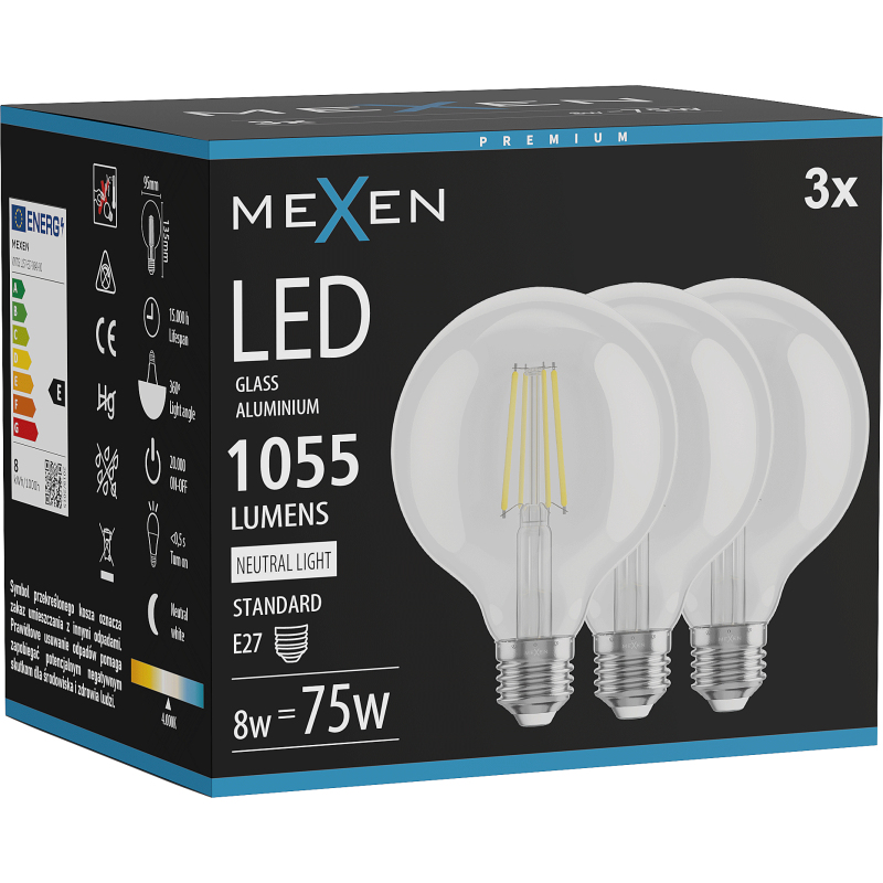 Mexen Vintis 3x LED žárovka s vláknem E27, G95, 8W, neutrální - 4000K, 1055 lm, čirá - L157-E27-0840-00x03