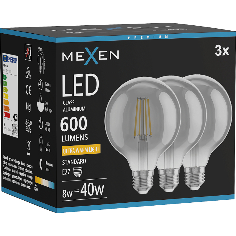 Mexen Vintis 3x LED žárovka s vláknem E27, G95, 8W, teplá - 2200K, 600 lm, kouřová - L157-E27-0822-70x03