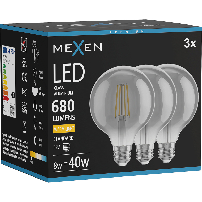 Mexen Vintis 3x LED žárovka s vláknem E27, G95, 8W, teplá - 2700K, 680 lm, kouřová - L157-E27-0827-70x03
