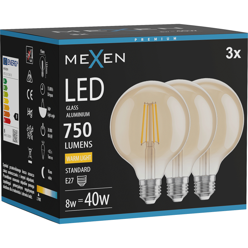 Mexen Vintis 3x LED žárovka s vláknem E27, G95, 8W, teplá - 2700K, 750 lm, jantarová - L157-E27-0827-50x03