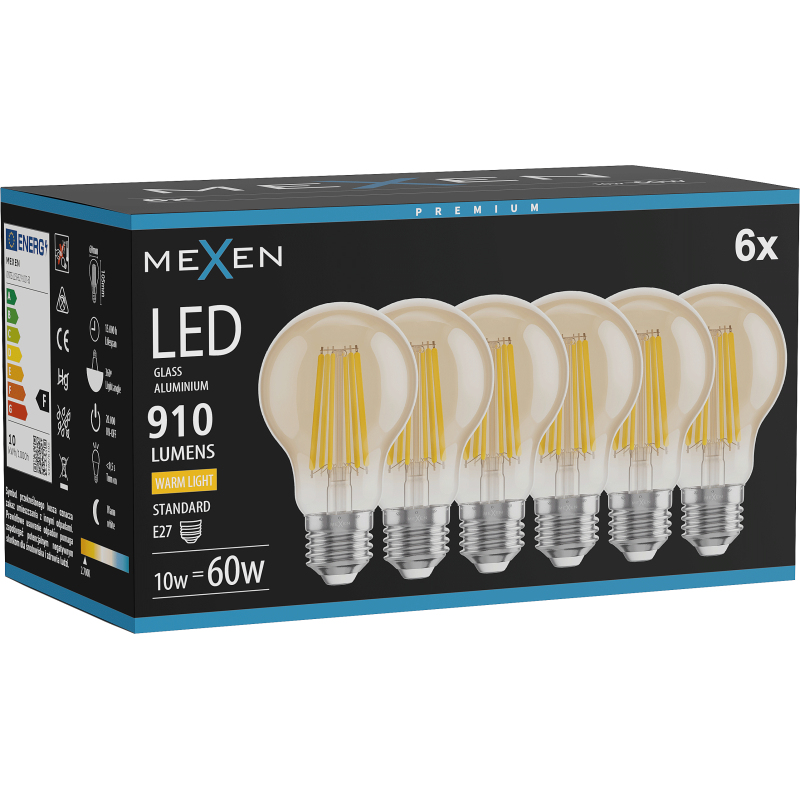 Mexen Vintis 6x żarówka filament LED E27, A60, 10W, Ciepła - 2700K, 910 lm, amber - L150-E27-1027-50x06