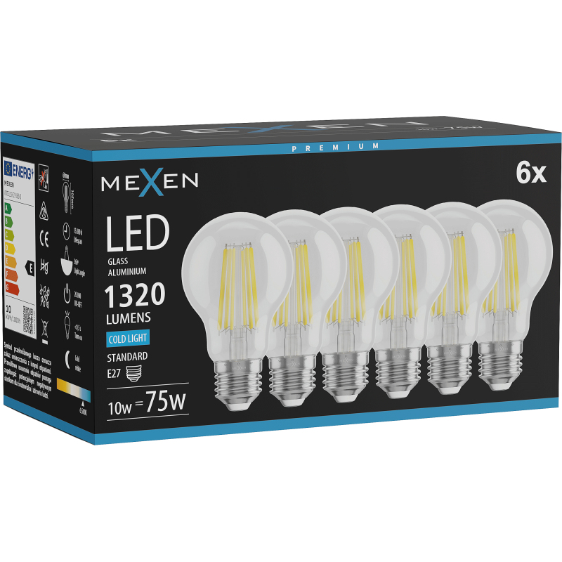 Mexen Vintis 6x żarówka filament LED E27, A60, 10W, Zimna - 6500K, 1320 lm, clear - L150-E27-1065-00x06