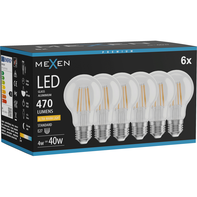 Mexen Vintis 6x żarówka filament LED E27, A60, 4W, Ciepła - 2200K, 470 lm, clear - L150-E27-0422-00x06