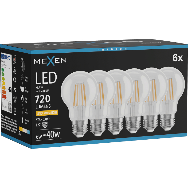 Mexen Vintis 6x żarówka filament LED E27, A60, 6W, Ciepła - 2200K, 720 lm, clear - L150-E27-0622-00x06