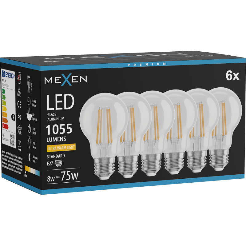 Mexen Vintis 6x żarówka filament LED E27, A60, 8W, Ciepła - 2200K, 1055 lm, clear - L150-E27-0822-00x06