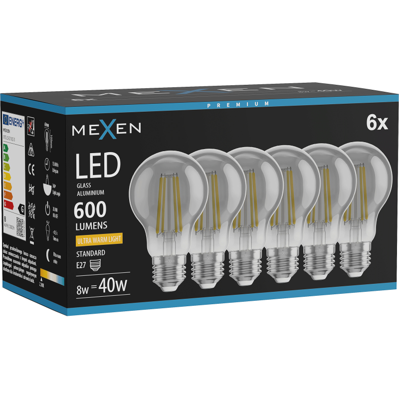 Mexen Vintis 6x żarówka filament LED E27, A60, 8W, Ciepła - 2200K, 600 lm, smoke - L150-E27-0822-70x06