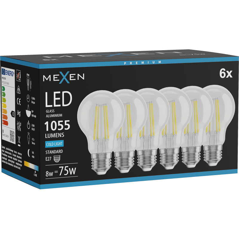 Mexen Vintis 6x żarówka filament LED E27, A60, 8W, Zimna - 6500K, 1055 lm, clear - L150-E27-0865-00x06