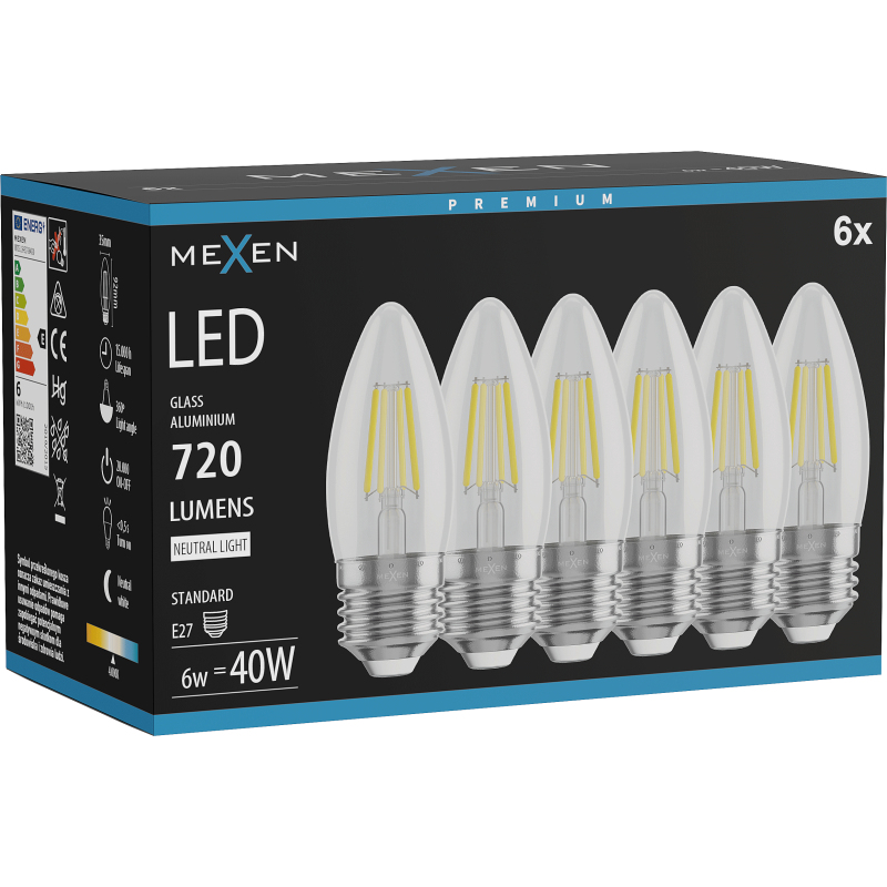 Mexen Vintis 6x żarówka filament LED E27, C35, 6W, Neutralna - 4000K, 720 lm, clear - L154-E27-0640-00x06