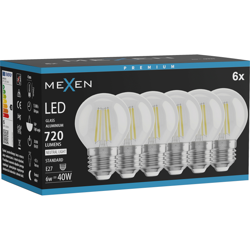 Mexen Vintis 6x żarówka filament LED E27, G45, 6W, Neutralna - 4000K, 720 lm, clear - L156-E27-0627-00x06