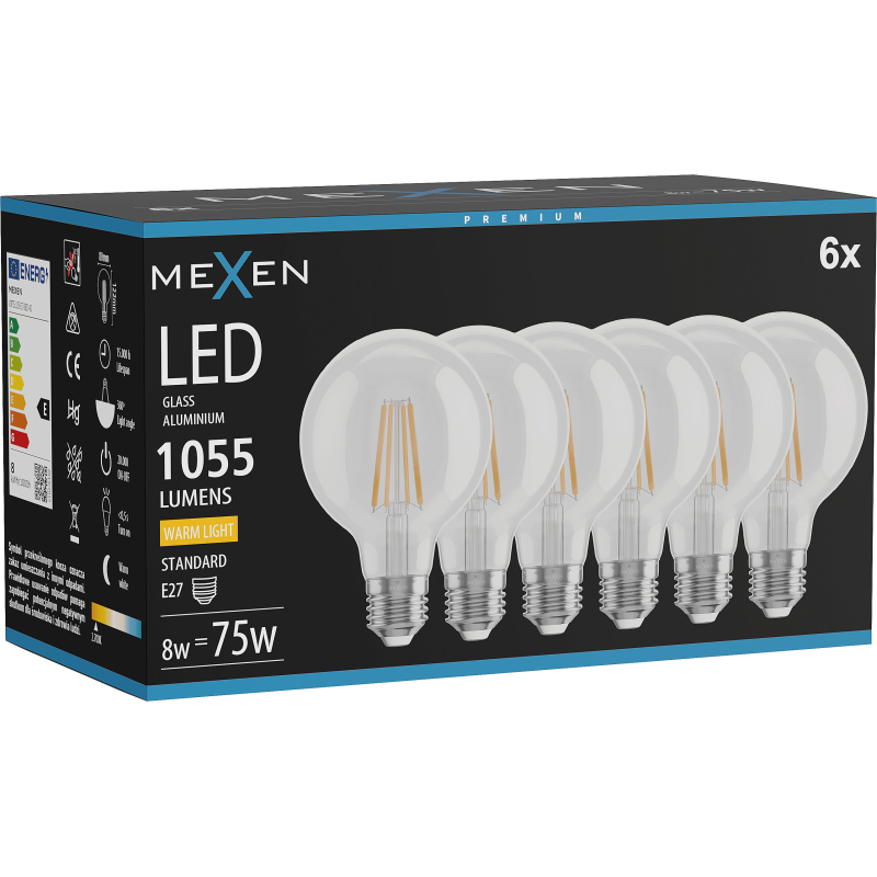 Mexen Vintis 6x żarówka filament LED E27, G80, 8W, Ciepła - 2700K, 1055 lm, clear - L155-E27-0827-00x06
